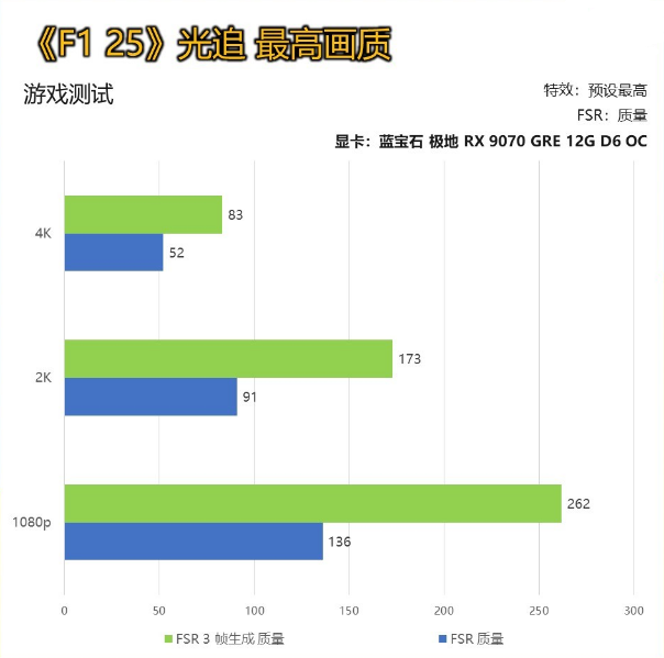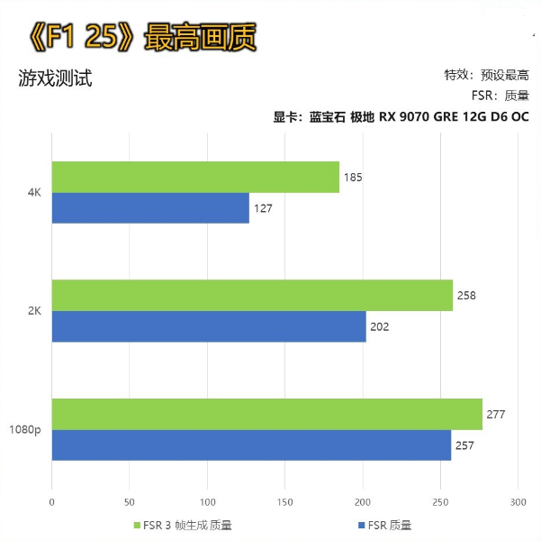 测试均默认开启FSR,并调节为质量档位,对比FSR 3帧生成与关闭FSR帧生成选项。 另外需要说明的是,相比FPS或动作游戏,赛车游戏对帧数要求不高,60帧以上即可流畅体验无卡顿感。 在纯光栅化游戏测试中,蓝宝石 极地 RX 9070 GRE 12G D6 OC在4K分辨率下,开启FSR 3帧生成能够达到185帧的电竞级帧率。