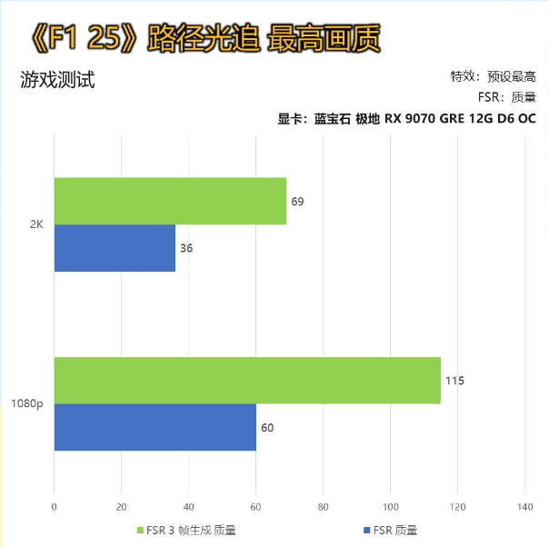 另外值得一提的是,蓝宝石 极地 RX 9070 GRE 12G D6 OC凭借RDNA4架构在光线追踪中的进步,《F1 25》即便光线追踪全开,也能在4K分辨率下流畅运行。虽然赛车游戏对帧数要求相对较低,但相比自身上一代产品的提升是巨大的。