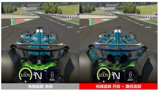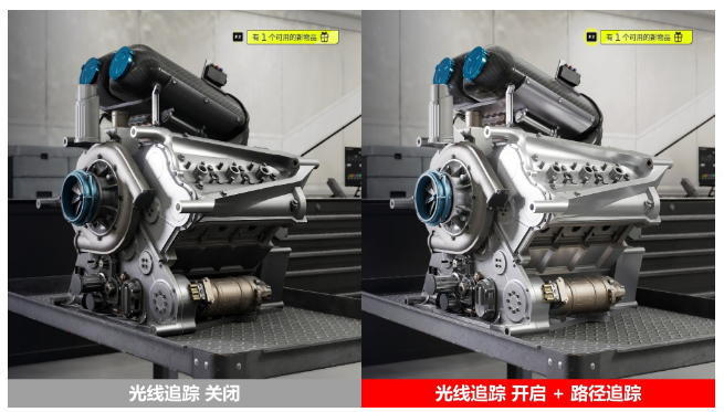 在车库中,赛车发动机为纯金属材质,对光的反射率较高,这里光追表现与上面车库地面的正好相反,开启光追+路径追踪后,即使是无直射光源的暗面,通过间接照明也足够亮。而在光源直射面,甚至能感觉到强光带来的眩目,非常接近真实的材质表现。