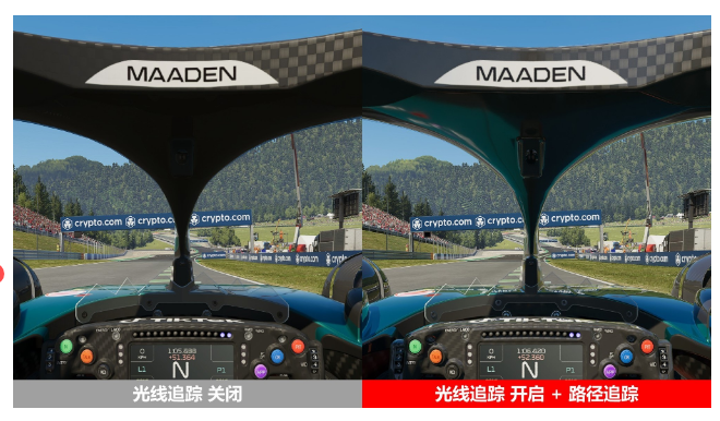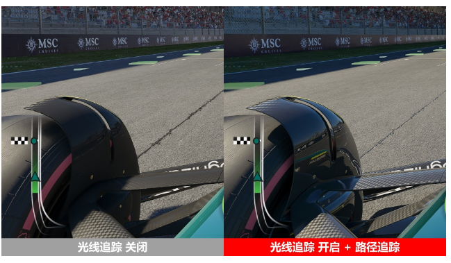 F1赛车整体采用碳纤与漆面,在阳光下反射率较高,原本轮胎处漆黑的光线,在开启光追+路径追踪后,被间接照明能够清晰显示与车身的连接结构。 另外值得注意的是,轮胎粉色的条纹,在开启光追后,颜色会变淡,这也符合我们日常生活中的观感。
