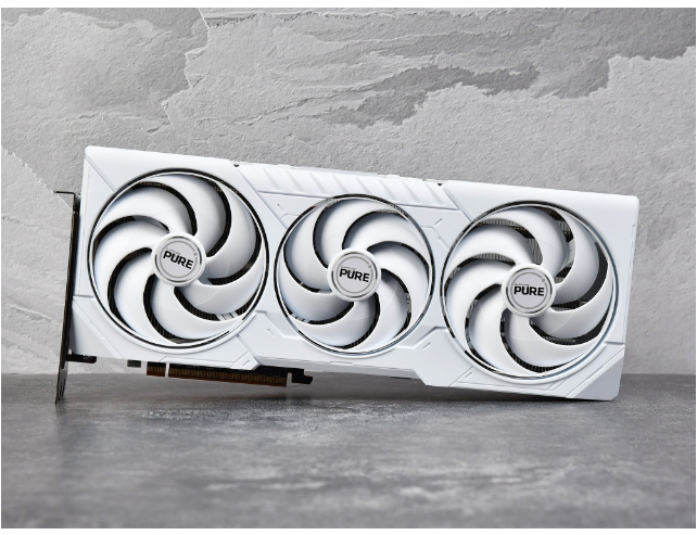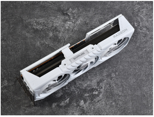 蓝宝石 极地 RX 9070 GRE 12G D6 OC卡身整体为“雪白色”,尺寸为320×120.25×61.6mm,采用三风扇全尺寸设计,占用3槽空间。主动散热部分采用2大1小的3个7叶飞翼轴流风扇,搭配双滚珠轴承结构,可高效散热并延长风扇使用寿命。