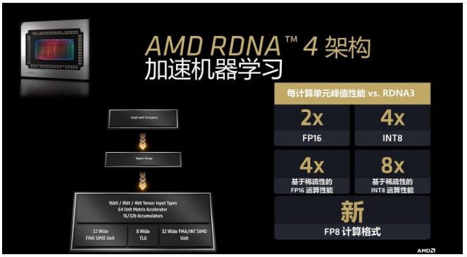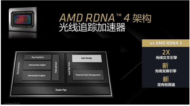 RDNA 4架构还重构了光线追踪加速器,相比RDNA 3带来了两倍的光线交叉引擎、全新的光线变化引擎以及全新的定向包围盒,通过双倍的光线交叉引擎以及先进的光追技术,RDNA 4相比RDNA 3每计算单元光追性能翻了一倍。而在加速机器学习方面,RDNA 4上新的FP8计算格式带来了更强大的运算性能,使其全面胜于RDNA 3架构。