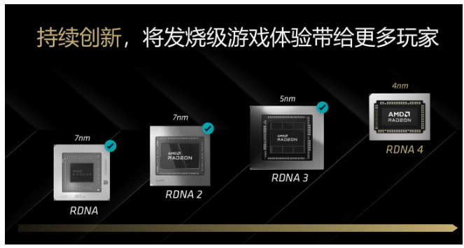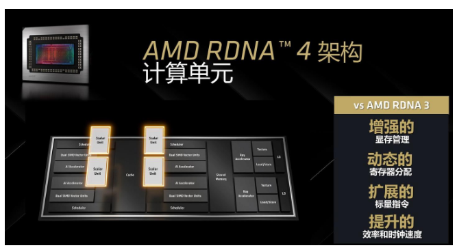 本次发布的RX 9000系显卡不仅跳过了“8000”这个数字,更在系列上以十位数加减划分,RX 9070级别则对应中端产品,熟悉NVIDIA显卡的玩家想必对这种命名方式并不陌生。 当然名字只是代号,是否值得被玩家记住,还要看实力如何。作为AMD最新一代显卡,RX 9000系采用了最新的RDNA 4架构,下面我们先来简单看一下其中变化。 1 RDNA 4 架构 本次RX 9000系显卡发布,最引人注目的当属全新的RDNA 4架构,本代RDNA 4架构采用先进的4nm工艺。在计算单元方面,RDNA 4架构对比RDNA 3架构来说,拥有增强的显存管理、动态的寄存器分配、扩展的标量指令以及更高的效率和时钟速度。