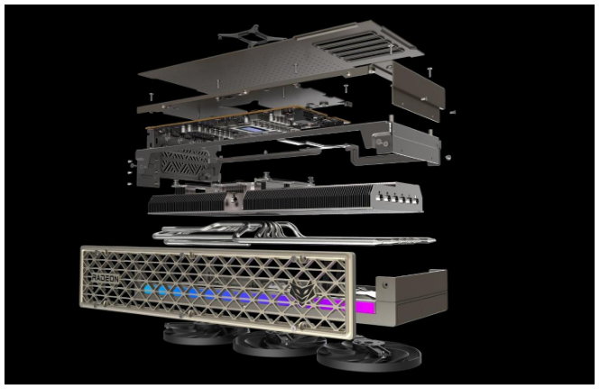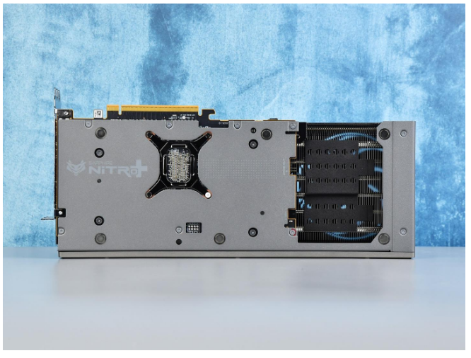 蓝宝石NiTRO+ 氮动RX 9070 XT 16G D6 OC采用3个7叶飞翼轴流风扇,可提供更大的风压和风量,并优化设计使得噪音更低,搭配双滚珠轴承结构,可高效散热并延长风扇使用寿命。同时采用了快拆设计,内部为触点卡扣链接风扇,为用户提供方便后期风扇清洁与维护。  蓝宝石NiTRO+ 氮动RX 9070 XT 16G D6 OC显卡创新的采用了双重背板设计,第一层为我们常见的一体式铝合金背板,在尾部可以看到大面积凹槽以及背插式供电接口。
