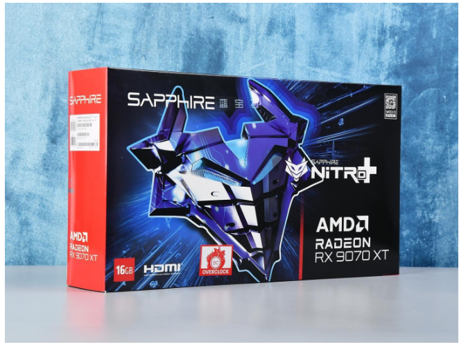 而随着RDNA 4一起登场的FSR 4通过基于ML的超分辨率技术,带来了高质量、低延迟的游戏体验,作为完全在AMD平台上开发、训练和优化出来的FSR 4,采用了可升级的API框架,支持FSR 3.1的游戏可以直接升级到FSR 4,有效节省开发者的时间。 2蓝宝石NiTRO+ 氮动RX 9070 XT 16G D6 OC 概览 下面首先来看一下本次评测的蓝宝石NiTRO+ 氮动RX 9070 XT 16G D6 OC,这个系列看起来比较陌生,但实际上可以把它看作以往的【超白金】系列,本代蓝宝石主要是根据NiTRO这个英文释义来重新划定的系列名称,让两者更加贴合。 当然除了名称上的改变,在外观设计上,蓝宝石NiTRO+ 氮动RX 9070 XT 16G D6 OC也进行了大刀阔斧的改动。  外包装以NiTRO+的系列logo,机器人面甲作为主视觉,主色调为蓝宝石标志性的蓝色,右下角则是型号名称,整体的红蓝设计非常具有代表性。
