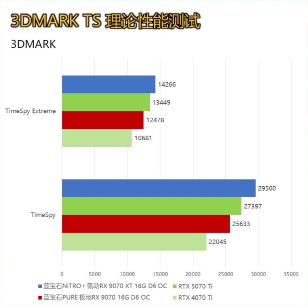 在针对显卡DX11性能的3DMARKFS套装测试中,共有4款显卡进行对比,除了本次评测的产品还有两代N卡的70 Ti级别产品。 蓝宝石NiTRO+ 氮动RX 9070 XT 16G D6 OC相较RTX 5070 Ti的综合提升为2%左右; 蓝宝石PURE 极地RX 9070 16G D6 OC相较RTX 4070 Ti的综合提升为17%左右。