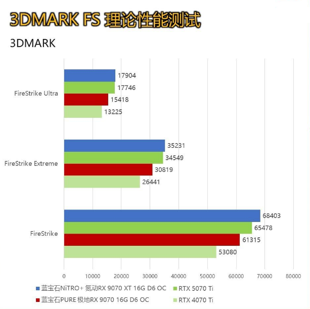 蓝宝石NiTRO+ 氮动 B850M WIFI主板是一款性价比极高的M板,拥有12+2+1路供电模组,支持DDR5 8000MHz高频内存,提供PCIe 5.0显卡以及M.2插槽,具有战未来的潜力,是当下AM5平台的绝佳选择之一。  规格方面,RX 9070与RX 9070 XT分别拥有3584个和4096个流处理器,采用RDNA4架构,Navi 48核心,均拥有16GB GDDR6显存,显存位宽为256 bit,带宽为644 GB/s。 蓝宝石PURE 极地RX 9070 16G D6 OC的Boost频率为2810MHz(标频2520MHz);蓝宝石NiTRO+ 氮动RX 9070 XT 16G D6 OC的Boost频率为3060MHz(标频2970MHz),均有较大提升。 5理论性能测试 下面先进行的是用来衡量显卡DX11理论性能的3DMARKFS套装:FS,FSE,FSU三者分别对应显卡在1080P、2K、4K的理论性能,取显卡分数实际测试结果如下: