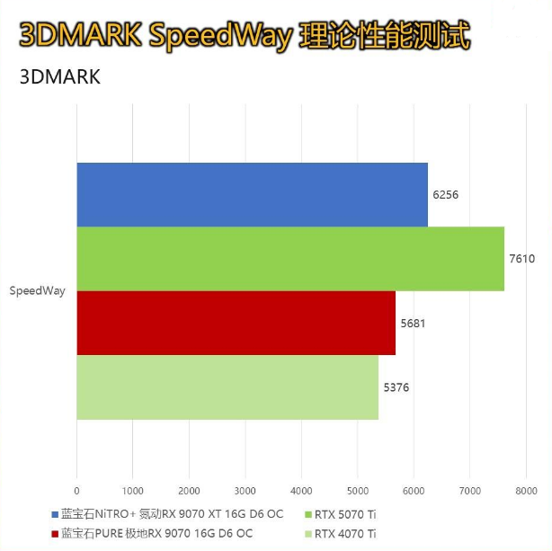 Speed Way测试是3DMARK最新更新的用于测试DirectX12 Ultimate 性能的显卡基准测试。这项测试结合了实时光线追踪和传统渲染技术来测量显卡性能。场景含有光线追踪反射、实时全局光照、网格着色器、体积照明、粒子和后处理效果。 蓝宝石NiTRO+ 氮动RX 9070 XT 16G D6 OC相较RTX 5070 Ti的差距为18%左右; 蓝宝石PURE 极地RX 9070 16G D6 OC相较RTX 4070 Ti的提升为6%左右。
