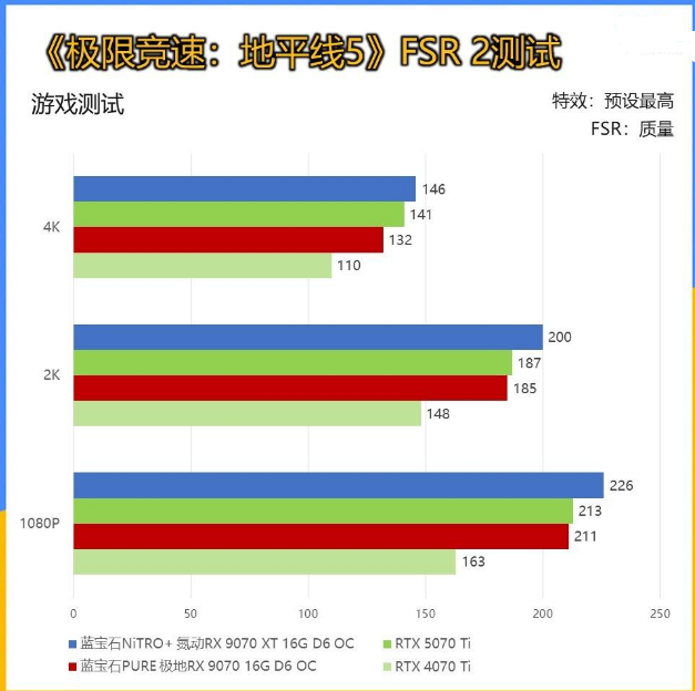 在3DMARK的FSR测试中,比较接近于实际的游戏帧数表现,同时也比较直观的反映出两款显卡的差距。RX 9070 XT相较RX 9070,三档分辨率综合提升约为15%左右。 6游戏/FSR 测试 本次评测由于时间关系,少部分游戏进行了4卡对比测试,我们主要还是看RX 9070 XT这张定位更高端的显卡性能。