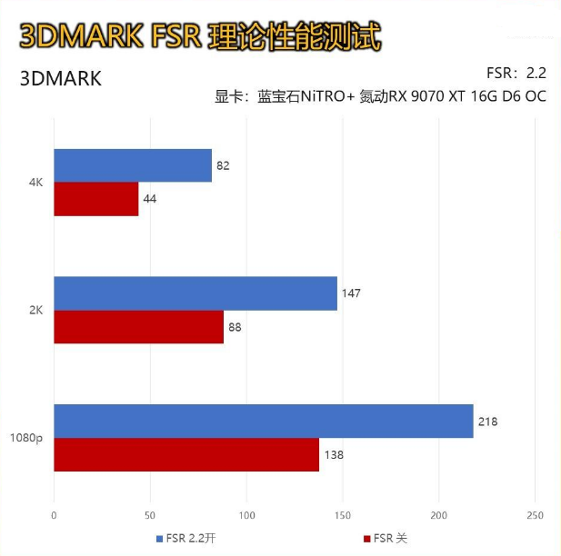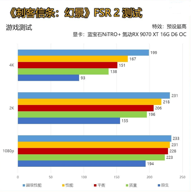 在《刺客信条:幻景》的测试中,我们关闭默认开启的自适应帧率,并打开FSR 2测试。 在4K分辨率中,蓝宝石NiTRO+ 氮动RX 9070 XT 16G D6 OC在开启FSR 2质量挡位即可轻松达到138帧,完全可以做到4K 3A游戏的电竞级体验。