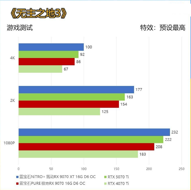 《地平线5》是显卡测试常客,凭借极其出色的优化,大部分玩家都能够享受到极致且高帧的游戏环境。 在测试中N卡开启DLSS 2;A卡开启FSR 2进行跑分测试,挡位均为最佳质量。 蓝宝石NiTRO+ 氮动RX 9070 XT 16G D6 OC相较RTX 5070 Ti的综合提升约为6%左右;而蓝宝石PURE 极地RX 9070 16G D6 OC的成绩更接近RTX 5070 Ti,整体优势相当明显。  《无主之地3》作为老牌3A游戏,非常能代表显卡之间的光栅化水平差距。并且该游戏无任何DLSS/FSR加持,跑分更纯粹。 蓝宝石NiTRO+ 氮动RX 9070 XT 16G D6 OC相较RTX 5070 Ti的综合提升为8%左右; 蓝宝石PURE 极地RX 9070 16G D6 OC相较RTX 4070 Ti的综合提升为22%左右。