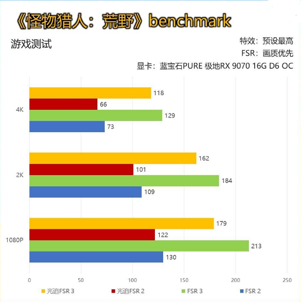 本次我们还测试了最新的《怪物猎人:荒野》benchmark跑分,不过由于目前游戏实际情况比较复杂,帧数会比benchmark更低,平均要再减30-40帧左右,所以测试结果仅供参考。 其中性能稍低的蓝宝石PURE 极地RX 9070 16G D6 OC在帧生成的加持下,2K分辨率可以达到184帧左右,而开启光追+FSR 3也能达到162帧,虽然怪猎荒野的光追效果不多,但可见的是AMD本代在光追计算方面的加强,反馈非常明显。