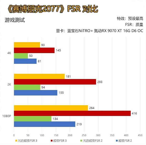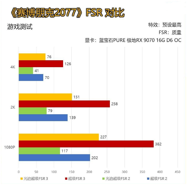 在《赛博朋克2077》中,测试分为【超级】画质与【光追超级】画质,固定FSR质量挡位。可以看到在开启FSR 3帧生成后,帧数有着质的飞跃,几乎达到FSR 2的2倍。 而且可喜的是,蓝宝石PURE 极地RX 9070 16G D6 OC在2K分辨率【光追超级】画质中,竟有151帧的成绩。虽然对比N卡依然稍显逊色,但于AMD自己来说,新架构所带来的提升显而易见。