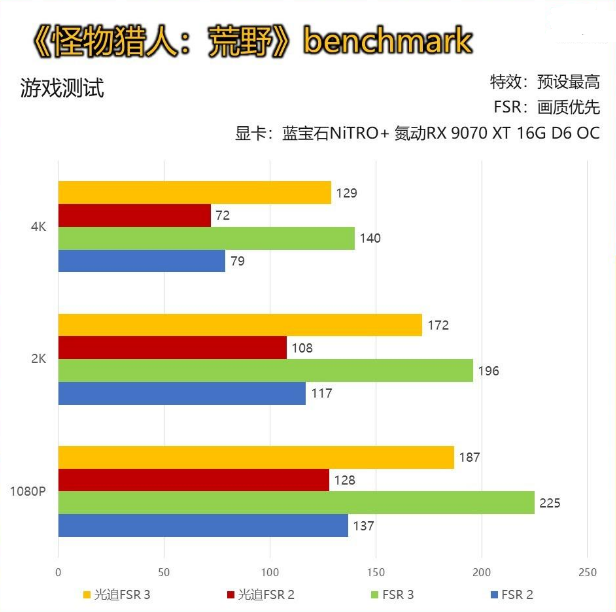 蓝宝石NiTRO+ 氮动RX 9070 XT 16G D6 OC在《怪物猎人:荒野》的表现与RX 9070相差不大,每项测试的帧数差距均为10帧左右。不过在4K分辨率下,单独开启FSR 3,即便游戏中有掉帧现象,平均帧率也能达到100以上,性能还是非常强悍的。