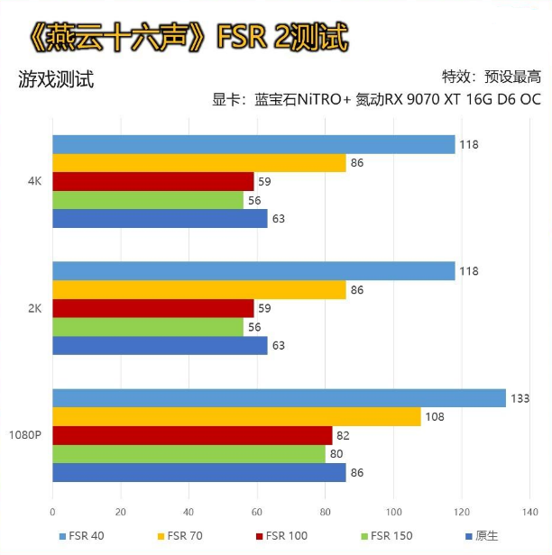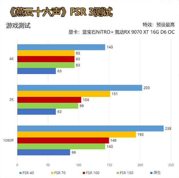 近来大火的《燕云十六声》我们同样进行了测试,画质默认最高。但在该游戏中FSR并没有明确档位。所以我们尝试了不同缩放下的帧数情况。 可以看到蓝宝石NiTRO+ 氮动RX 9070 XT 16G D6 OC在FSR 150和FSR 100的缩放区间帧数完全相同,该区间内的调节对游戏分辨率并无影响。 目前这款游戏似乎优化尚存在问题,由于采用了窗口全屏的模式,4K分辨率下,至少是在FSR 2模式的4K分辨率,无法得到正确的数据。