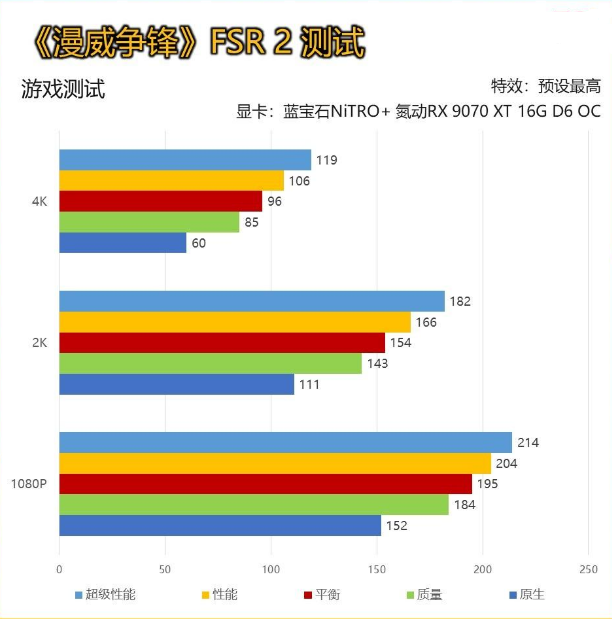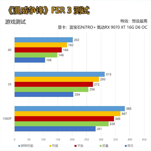 《漫威争锋》是网易推出的一款MOBA类对战免费网游,自推出便受到了极大地关注,并且目前在Steam的评价为“特别好评”,有兴趣的玩家不妨下载尝试。 同样在这款网游中,也集成了FSR 2和FSR 3。在《漫威争锋》的测试中,所有画质默认为最高,仅调节FSR档位来观察帧数变化。 蓝宝石NiTRO+ 氮动RX 9070 XT 16G D6 OC在4K分辨率平衡模式可达到近百帧的成绩,不过作为一款竞技游戏来说依然有些低,下面来看看开启FSR 3后的表现。