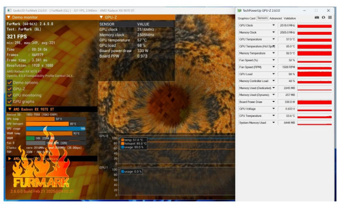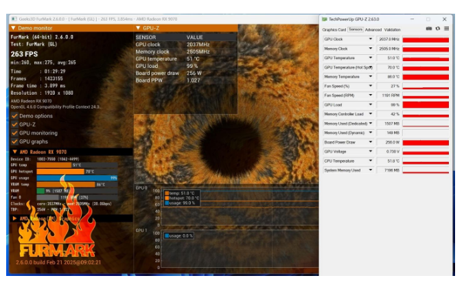 蓝宝石PURE 极地RX 9070 16G D6 OC在1小时左右的满载拷机中,温度稳定为51℃;热点温度70℃;显存温度86℃;风扇转速27%(1191 RPM),功耗为256W。