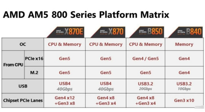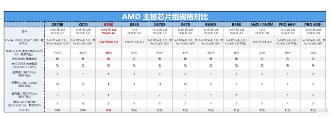 AMD B850芯片组规格 我们先来看看新的B850主板芯片组详细规格。作为一款主流级别的芯片组,AMD B850的规格无疑能够充分满足大多数用户的需求:1.它支持处理器与内存的超频;2.PCIe插槽与M.2固态硬盘插槽均支持最新的PCIe 5.0规范;3.原生提供USB 3.2 Gen2 x2 20Gbps接口;4.芯片组内置8条PCIe 4.0通道与4条PCIe 3.0通道。配合其合理的价格,主板制造商能够打造出性价比高、扩展性能出色的千元级别主板。