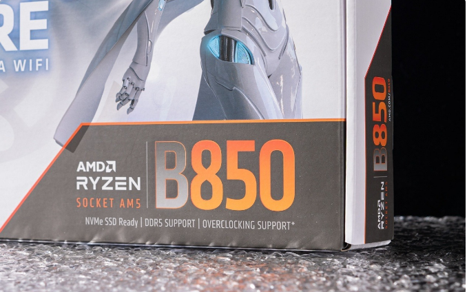 包装盒的右下角则标注了这款主板的芯片组配置,为AMD B850,并且不同于隔壁家的B系列主板,AMD的B系列主板不仅支持内存超频,还支持CPU超频。