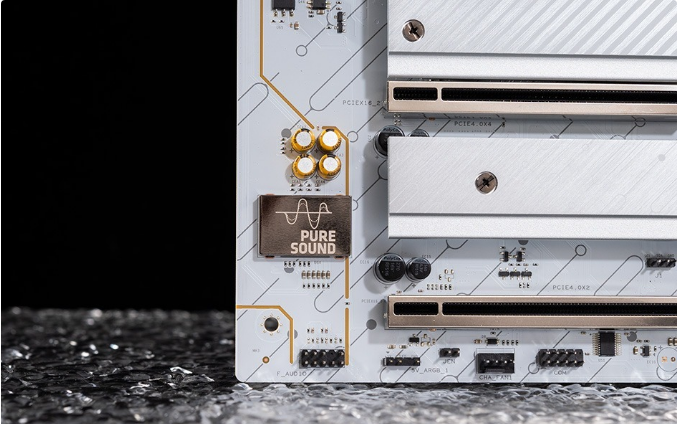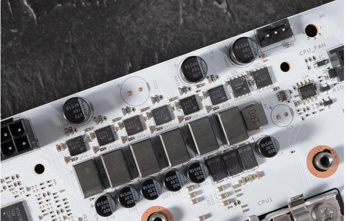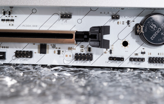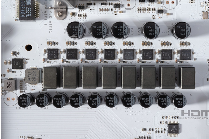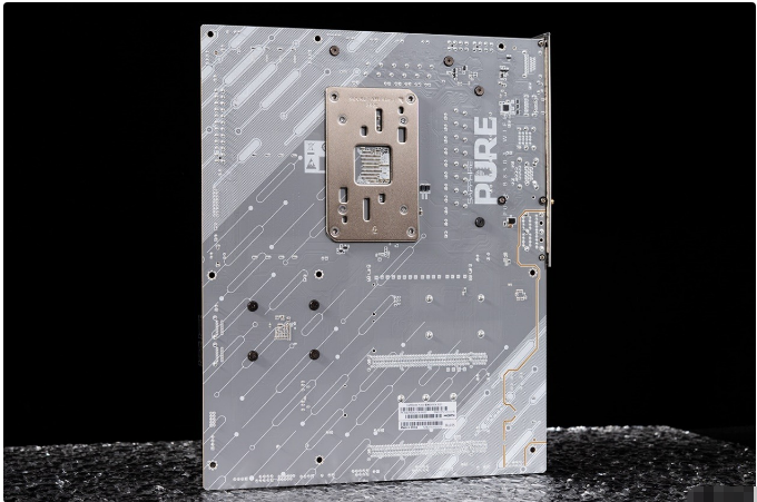 背面也做了白色处理,与正面相得映彰。走线也非常规整,做工同样出色,据介绍,其在内存与PCIe插槽处是采用了成本更高、技术更为先进的SMT贴片工艺,电气性能更佳。