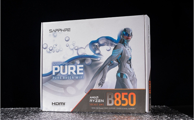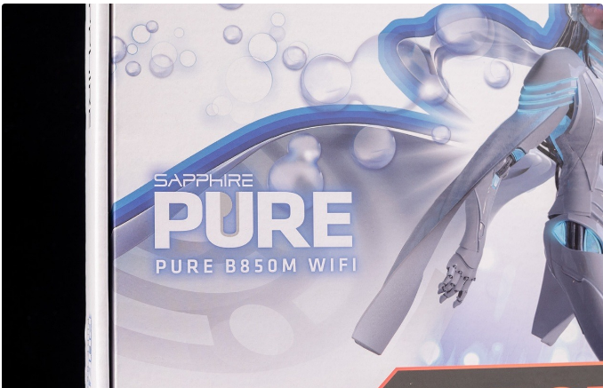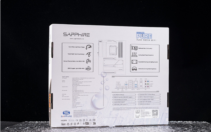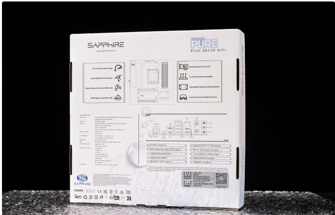 蓝宝石PURE极地B850A WIFI主板介绍 首先让我们先来看这次PURE极地B850系列的老大哥——蓝宝石PURE极地B850A WIFI主板,外包装设计上延续了过往PURE系列的特色,让人一眼就能看出这款主板主打的就是纯白设计,并且正面包装还有PURE系列独有的标识,科技感十足。