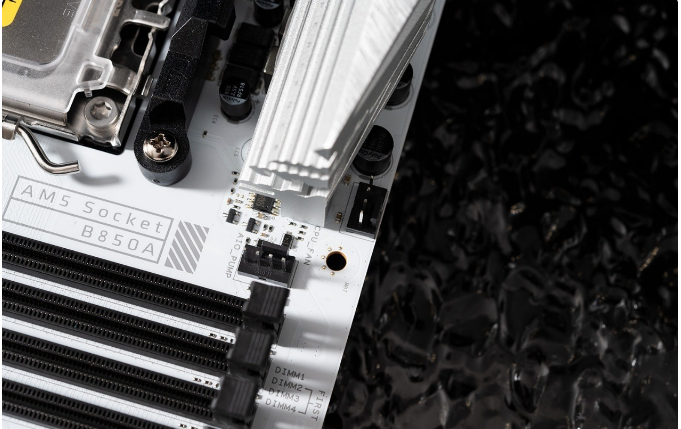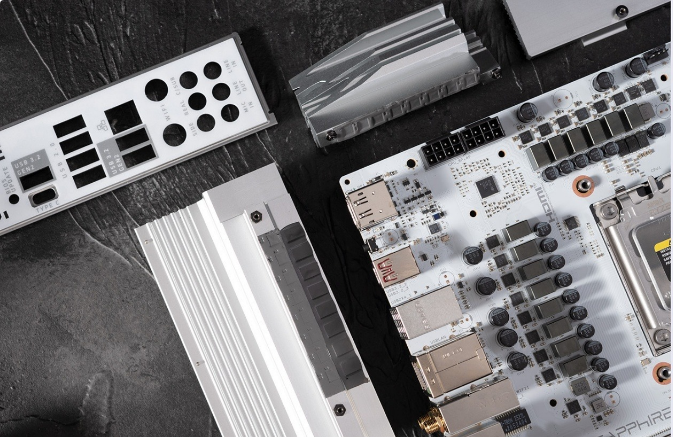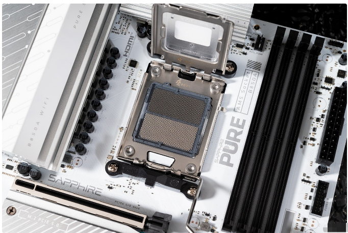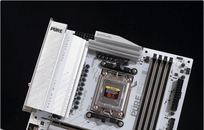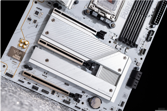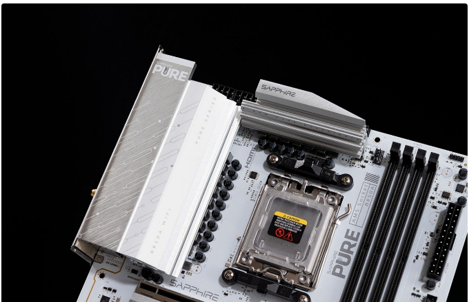 供电及VRM散热 蓝宝石PURE极地B850A WIFI主板最抢眼的应该就是这个银白色的散热装甲了,这款主板的散热装甲采用分体设计,面积都非常大,其中左侧的散热马甲更是延伸到了IO挡板位置,做成了全覆盖的设计。