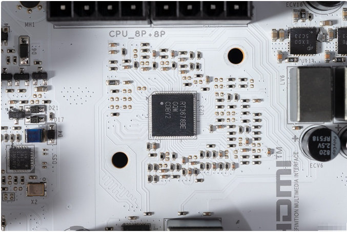 至于CPU与核显的PWM芯片则是RT3678E,这是一款8 + 2相的控制器,来自立锜科技。