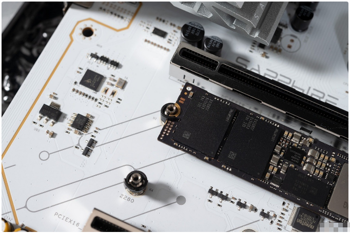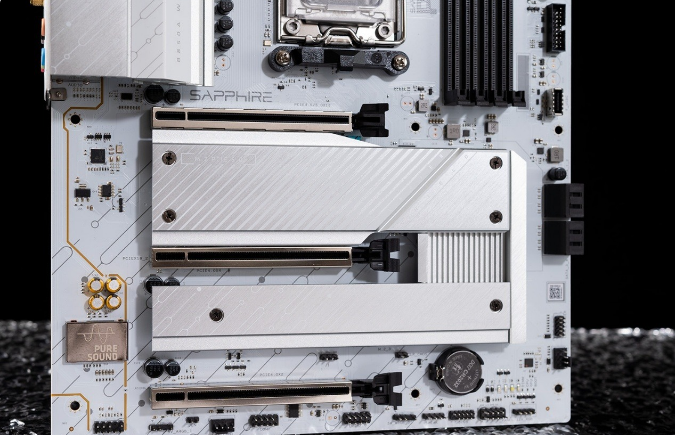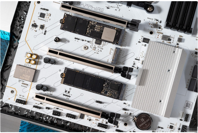 蓝宝石PURE极地B850A WIFI主板共有三个M.2固态硬盘位,其中靠近CPU底座的一组为PCIe 5.0×4标准,剩下的两组则是PCIe 4.0×4标准。