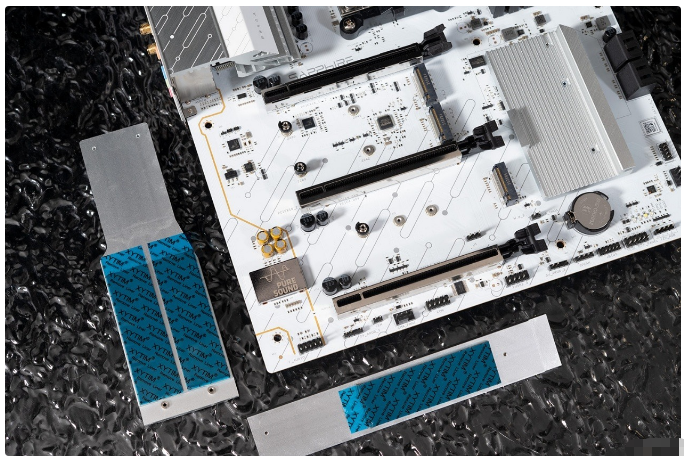 并且散热装甲上在电子元器件覆盖处还有高导热系数的导热垫,能够将电感、DrMos等元件的热量快速导出。
