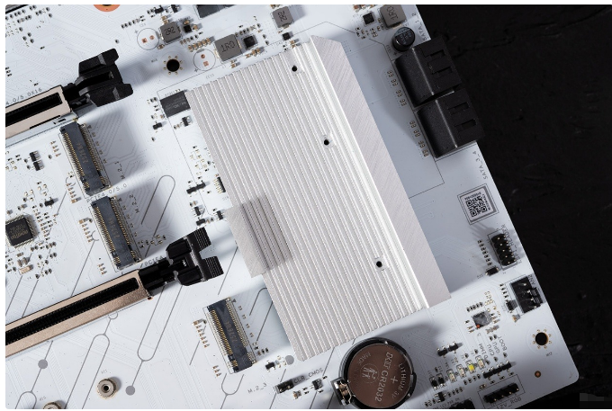 M.2固态硬盘插槽 在PCIe插槽之间是两块银白色的散热装甲,这里是主板M.2固态硬盘的位置。