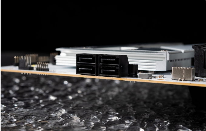 另外,主板侧边还有4个SATA接口,兼容旧的存储设备接口,包括机械硬盘,以及光驱产品等,最高支持6Gbps的传输速度。