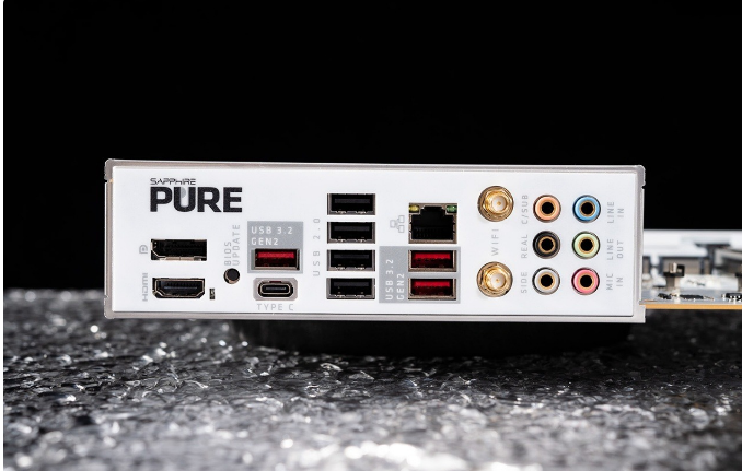 后置IO接口 最后我们再来看看蓝宝石PURE极地B850A WIFI主板的后置IO接口,不得不说配置还是非常丰富的,从上到下依次是1个DP,1个HDMI,4个USB 2.0接口,3个USB 3.2 Gen 2接口、1个USB 3.2 Type-C Gen 2接口;此外还包括1个2.5G有线网口、Wi-Fi 6天线接口以及声道音频接口。这款主板后置还有一个UPDATE BIOS按钮,以及前置提供Clear BIOS按钮和DEBUG指示灯,实用性拉满。