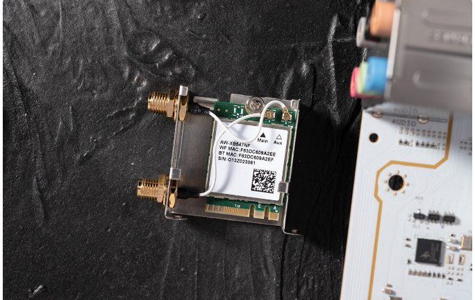 拆开挡板还可以看到其无线网卡配置,是来自Realtek瑞昱的RTL8852BE无线组网方案(型号AW-XB547NF),具备2T2R MIMO功能,提供高达1200Mbps的最高速度,并且支持WiFi6传输速率以及蓝牙5无线传输技术。