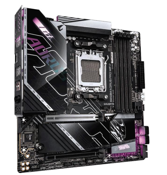 内存方面,支持4条DDR5插槽,搭配AI D5黑科技2.0可实现内存超频至9000+,最高容量可拓展至256GB。扩展接口也非常丰富,包含2个PCI-e 5.0 M.2插槽、3个PCI-e 4.0 M.2插槽、1个PCI-e 5.0 x16显卡插槽、2个40GbpsType-C接口等,满足高速存储与多设备连接需求。独创X3DTurbo Mode2.0技术,通过AI算法一键切换游戏/生产力模式,游戏时优先调用3D-Cache核心提升帧率,生产力场景则激活全核性能,无需复杂设置即可释放硬件潜能。 技嘉B850M AORUS PRO WIFI7 电竞雕 看完上面推荐的两款,肯定就会有玩家问了,如果我预算有限但也想体验9800X3D的性能,有没有合适的主板呢?当然有!相较于X870高昂的售价,B850系列的性价比更加出色。技嘉B850M AORUS PRO WIFI 7电竞雕是专为M-ATX机型设计,主板采用12+2+2相数字供电,搭配大面积的散热装甲,可为9800X3D提供稳定的运行环境。