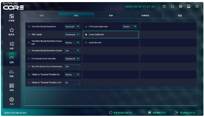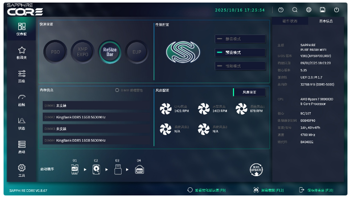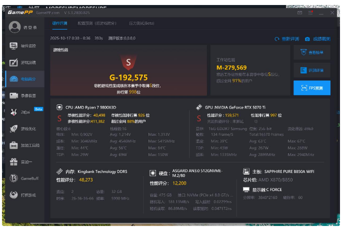 今天分享一款白色板子-蓝宝石PURE极地 B850A WIFI,白色海景房或者侧透箱子用户可以关注下~ 外观速览蓝宝石PURE极地 B850A WIFI使用白色PCB+白色散热装甲,本身没有太复杂的纹路设计,简约精致,比较耐看。 蓝宝石PURE极地 B850A WIFI使用12+2+1相供电,罕见的双8Pin供电接口可为AMD R9系列旗舰芯片提供充足动力。 内存部分,官宣支持频率支持到8000+MT/s,单条支持容量为48GB,四条最大容量为192GB,当然因为AMD内存控制器性能一般的关系,选择6000MT/s的大容量内存依旧是优解。 蓝宝石PURE极地 B850A WIFI的纠错灯在主板右下角,散热装甲也不遮挡电池,电池一侧有CLR COMS针脚,装机测试时还原BIOS还是比较方便的。主板上的4个SATA接口使用横向设计,走线更美观。 主板左下角的Realtek ALC897高保真解码芯片最高支持5.1声道,当然大部分用户都是接2.0箱子的,音频芯片性能是完全够用的。 三个PCIE插槽主板目前确实越来越少了,其分别支持PCIE 5.0x16、PCIE 4.0 x4、PCIE 4.0 x2,有特殊需求的用户可以用来接入声卡、网卡、固态拓展等。 取下固态位散热装甲,可以看到3个M.2固态位,分别支持 PCIe 5.0 X4、PCIe 4.0 X4、PCIe 4.0 X4协议,目前可优先使用PCIe 4.0固态位,后续等 PCIe 5.0 X4普及后再升级。 主板后置接口按键包含DP*1、HDMI*1、USB2.0*4、USB3.2Gen2*3、USB 3.2 Gen2 Type c*1、2.5G网口、WiFi 6天线接口以及6个3.5mm音频口。 主板无线网卡型号为RTL8852BE,支持WiFi6,支持蓝牙5.2,5G频段下速率可达1200Mbps,天线拧紧后可任意角度悬停。 主板背面可以看到CPU底座做了金属加固,灰白色涂装带有斜向装饰纹路,设计感还是有的。 BIOS蓝宝石的新BIOS设计还挺简约的,首页可一键开启PBO、EXPO、性能模式等,硬件信息在页面右侧,左侧可切换到高级、超频、状态等高级设置栏,风扇运行模式、转速等也能快速调整。 超频栏內可以手动开启PBO,这里详细设置参数如上,9800x3D频率提升了200MHz,主板也预设了PBO模式,适合小白玩家使用。 内存时序这边也可以手动调整,适合有动手能力的玩家,这里我就使用默认的EXPO设置,稳定性放第一位。 整机展示配置清单如下: CPU:AMD 9800x3D 主板:蓝宝石PURE极地 B850A WIFI 内存:金百达星刃6000 32GB 固态:阿斯加特 AN3.0 显卡:索泰RTX5070Ti 白OC 机箱:安钛克FLUX 白 散热器:钛钽LG600 360 电源:振华LEADEX PROA850W 安钛克FLUX本身具备出色的散热风道、支持EATX大板、支持背插主板、方便离线藏线,在侧透机箱中设计相当优秀,在外观方面,创新性的将胡桃木材质和金属融合,美学设计别具一格,辨识度相当高。 钛钽LG600的冷排和风扇比常规风扇明显要厚一些,外型设计简约时尚,超窄边风扇风量有保障,风扇本身也支持ARGB效果,发光面积比较大。 3.95英寸方正屏幕可以自定义图案、动画、天气、时钟等,屏幕侧边还带RGB灯区,颜值和可玩性都非常高。 三窄边的屏幕素质还是不错的,色彩饱满,颜色过渡没有断层,正常距离观看也没有任何颗粒感。 索泰RTX5070Ti 白OC是比较少数的纯白显卡,LOGO也支持ARGB效果,本身两槽厚度,可以很好的搭配海景房以及一些紧凑型机箱。性能方面和9800x3D搭配,可以畅玩各类3A大作。 组图分享综合测试对比下默认模式和性能模式下手动开启PBO后,CPU-Z单核跑分从782提升到832,多核跑分从8563提升到8943,综合提升在5%左右。 内存这边测试开启EXPO后,金百达星刃读写拷贝从51505、70954、49261MB/s提升到58396、80481、54826MB/s,延迟从100.9ns降低到79.1ns,综合提升10%左右。 使用GamePP跑分,游戏性能得分192575,工作站性能得分279569,整体处于s段位水准。 使用《黑神话:悟空》基准测试工具,超高画质,超采样清晰度50,开启帧生成,4k模式下平均帧率111,运行十分流畅。 使用《怪物猎人:荒野》测试,4K模式下开启最高画质,开启帧生成,平均帧率108.09。总的来说,这套配置畅玩4K没啥太大问题。 双烤测试中,9800x3D频率稳定4.67GHz,温度仅82摄氏度,功耗140W,钛钽LG600 360散热能力还是相当强的;5070Ti功耗300W,温度69.7摄氏度,频率2355Mhz,总体来说,整机散热还是相当不错的。 总结