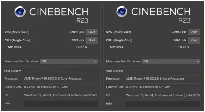 就CineBench的基准测试结果来看,并没有什么意外,9850X3D的单核以及多核性能较之9800X3D均有小幅提升,不过幅度并不算大。更加明显的差距我们还是需要进入游戏中才能清晰地观察到。