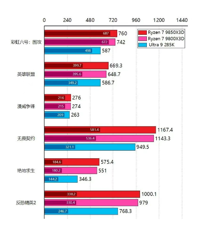 就测试结果来看,虽然显卡在很多时候决定了帧数上限,但9850X3D凭借巨大的缓存空间和更高的出厂频率,依然有着亮眼的发挥。