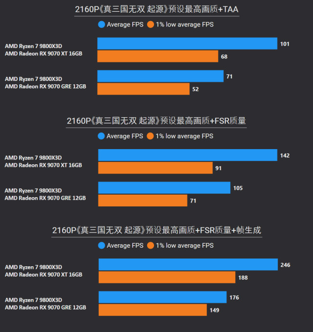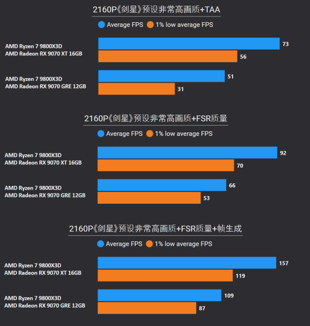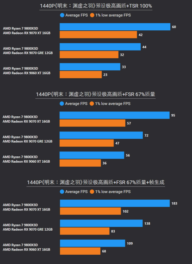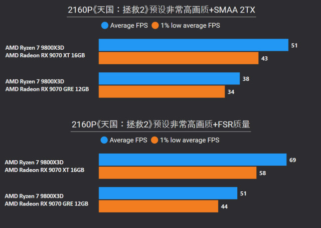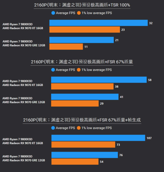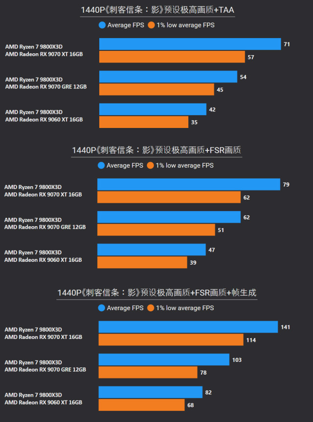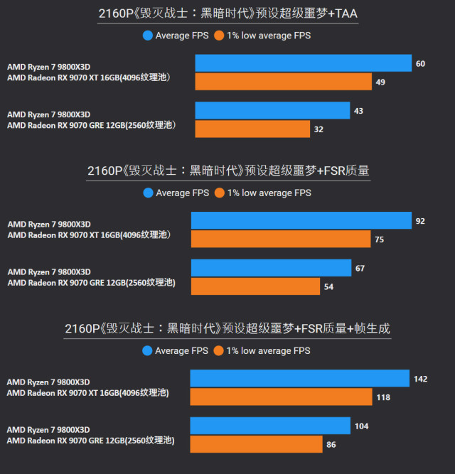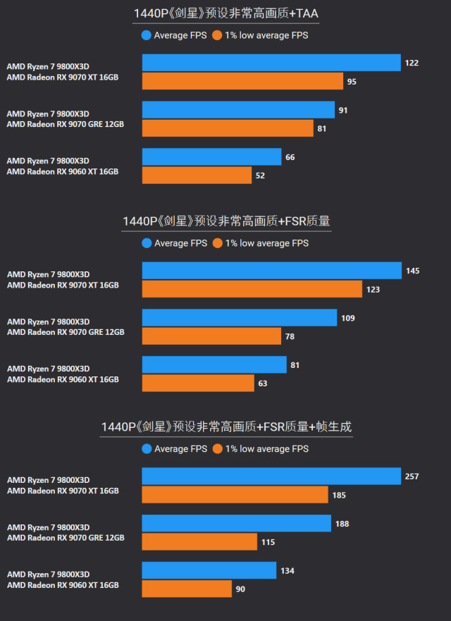前言对于追求性价比的玩家来说,A卡通常会成为他们的首选,毕竟同等级性能要比N卡高出一截。最新的RX 9000系列这一代,还有FSR Redstone(红石)技术强力加成,游戏体验也大大提升。 临近春节,宅家玩游戏相信会是不少人的日常,本文就挑选了一些2025年度的3A游戏进行测试,来看看A卡表现到底给不给力吧~ 本次参与测试的三款A卡: RX 9000系列中呼声最高的显卡——RX 9070 XT自然是不会缺席,虽然并不是真正意义的大核心,但它确实是被玩家誉为最佳性价比4K游戏卡。 RX 9070 GRE作为国内特供卡也极具代表性,经过一波调价之后性价比拉爆,性能追着RTX 5070走。 RX 9060 XT 16GB则是定位甜点卡,其大显存在当前8GB已捉襟见肘的3A游戏环境中优势明显,表现更为从容。 显卡介绍、配置环境和测试游戏第一款是蓝宝石RX 9070 XT NiTRIO+氮动OC,外观采用一体式框架、独特纹路形成了简洁和大胆的工业风格,它拥有12层多倍铜PCB、16相数字供电、6根复合热管等豪华配置,采用全新12V-2x6供电接口并且隐藏在背部。 第二款是蓝宝石RX 9070 GRE PURE极地OC,为国区特供型号,也是同样风格的纯白设计,内部用料和RX 9070比较相似,配备5根优化复合热管和PTM7950超导热膏,并有一体式框架加固设计。 第三款是蓝宝石RX 9060 XT 16GB PURE极地OC,采用RX 9000家族新一代极地纯白导流罩,侧面有RGB LOGO灯,双飞翼轴流扇主打紧凑型——只有240mm可兼容不少ITX机箱,它内置了3根复合热管、PTM7950导热膏、一体式散热模组、一体式框架设计等扎实用料。 测试平台方面,为了确保最大程度发挥三款显卡的性能,CPU使用了锐龙7 9800X3D,设置开启PBO,主板是技嘉B850M AORUS PRO WIFI7电竞雕,搭配两根DDR5 6000C26 16GB*2内存套装,操作系统是Windows 25H2最新版本,显卡驱动是AMD Adrenalin 25.12.1最新版本。 具体测试游戏如上图所示,都是2025年度有一定知名度的3A大作(仅一款不支持FSR 4),除了《毁灭战士:黑暗时代》是强制开启光追,其他直接拉满预设光栅画质,测试原生抗锯齿、FSR质量档和FSR质量档+帧生成三种情况,涉及分辨率是2K和4K不包含1080P,更贴合3A大作的偏好以及当前2K显示器普及情况。 10款3A游戏2K分辨率帧率对于2K分辨率,开启原生抗锯齿情况下,RX 9070 XT所有游戏都能轻松跑满60fps+,有一半游戏能超过100fps高帧标准,而且在使用FSR质量档后,因为所有游戏都能达到80fps+的原始帧率,再叠加帧生成,高帧体验也会更丝滑和跟手。 RX 9070 GRE本身则定位2K全能卡,原生下其中8款游戏都能达成60fps+,《刺客信条:影》和《明末:渊虚之羽》则使用FSR质量档后方可安全越过60fps+! RX 9060 XT 16GB,原生下有6款游戏达到60fps标准,其余3款使用FSR质量档后可达成55fps+,只有《刺客信条:影》确实是比较吃力一点,刚过45fps标准,它还有一个明显的优势:大显存可以确保贴图不会延迟加载或者模糊。 10款3A游戏4K分辨率帧率来到更为苛刻的4K分辨率,RX 9070 XT在原生抗锯齿下达成60fps标准的游戏有6款,剩下的4款借助FSR质量档也可达成60fps标准,所有游戏开启帧生成体验无压力,不愧是最佳性价比4K游戏卡。 4K分辨率对于RX 9070 GRE则属于越级挑战,一些游戏确实会出现12GB显存不够用的情况,不过借助FSR质量档,仍有5款游戏能达成60fps标准。说到这份上就不得不提《毁灭战士:黑暗时代》,它通过调整纹理池大小的方式,让显存分配更合理。 扩展测试:大模型推理和视频剪辑RX 9060 XT 16GB使用AMD ROCm模式运行DeepSeek R1 Distill Qwen 14B大模型(GPU卸载MAX),推理速度达到30.83 token/s RX 9070 GRE使用AMD ROCm模式运行DeepSeek R1 Distill Qwen 14B大模型(GPU卸载MAX),推理速度达到39.50 token/s RX 9070 XT使用AMD ROCm模式运行DeepSeek R1 Distill Qwen 14B大模型(GPU卸载MAX),推理速度达到54.44 token/s 随着驱动和AMD ROCm软件堆栈优化,A卡在AI领域性能也比之前大大提升,对于14B参数量这种常规模型,三款显卡推理效率都很不错,对标同级N卡是没有问题的。 值得一提的是,本月AMD ROCm还会更新到7.2版本(AI性能相比老版提升了5倍),并集成于Adrenalin Edition 26.1.1即将更新的Windows驱动中,到时再给大家体验一下。 RX 9060 XT 16GB在Procyon Video Editing Benchmark 1.5中总分为34345 RX 9070 GRE在Procyon Video Editing Benchmark 1.5中总分为42989 RX 9070 XT在Procyon Video Editing Benchmark 1.5中总分为57202 目前最热门的内容创作自然是视频剪辑,三款A卡无论是1080P还是4K视频素材,联合CPU进行加速,导出效率都是非常高的,RX 9070 XT在4K测试素材中表现尤为出色,用时仅41.9s,和其他两款显卡拉开明显差距。 总结又到总结时间,本次测试的三款A卡定位都十分精准: RX 9070 XT作为最新RX 9000系列显卡的扛把子,4K分辨率游戏体验确实给力,不少游戏还能达到高帧水平,关键售价比对标的RTX 5070 Ti要实惠不少。 RX 9070 GRE是国内特供卡,从本文测试中不难看出2K分辨率是它的甜点区,迎合当下流行的2K分辨率游戏环境。 至于RX 9060 XT 16GB在2K分辨率中表现也游刃有余,原生性能不够FSR技术来凑,更重要是大显存确实从容,推荐给重度电竞、轻度3A游戏的玩家。