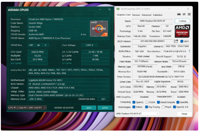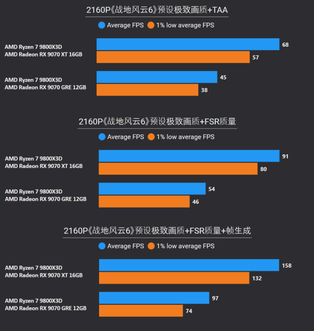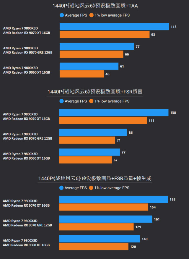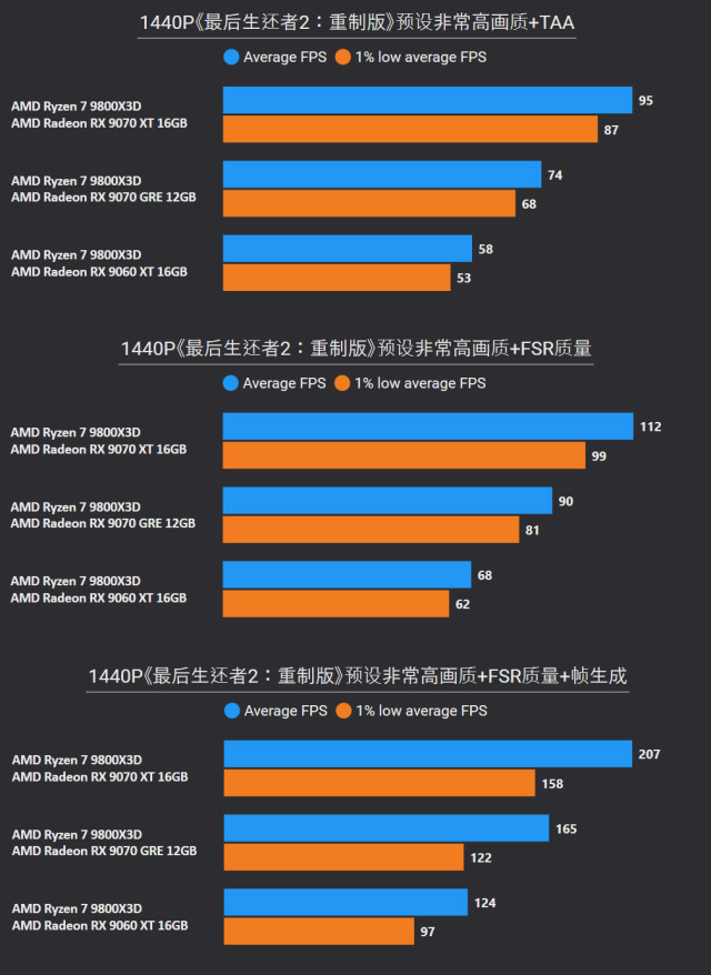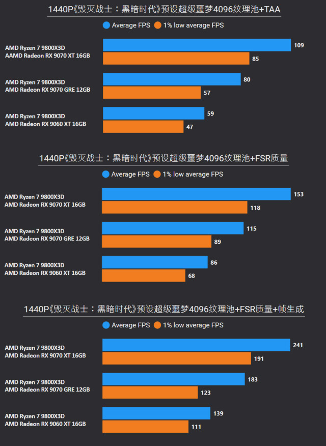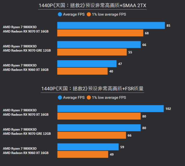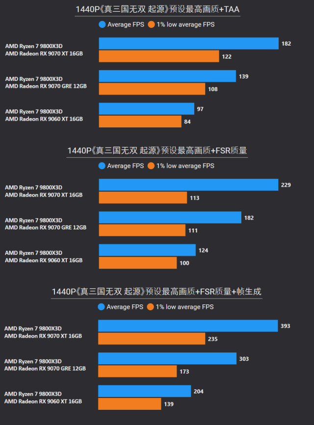 前言对于追求性价比的玩家来说,A卡通常会成为他们的首选,毕竟同等级性能要比N卡高出一截。最新的RX 9000系列这一代,还有FSR Redstone(红石)技术强力加成,游戏体验也大大提升。 临近春节,宅家玩游戏相信会是不少人的日常,本文就挑选了一些2025年度的3A游戏进行测试,来看看A卡表现到底给不给力吧~ 本次参与测试的三款A卡: RX 9000系列中呼声最高的显卡——RX 9070 XT自然是不会缺席,虽然并不是真正意义的大核心,但它确实是被玩家誉为最佳性价比4K游戏卡。 RX 9070 GRE作为国内特供卡也极具代表性,经过一波调价之后性价比拉爆,性能追着RTX 5070走。 RX 9060 XT 16GB则是定位甜点卡,其大显存在当前8GB已捉襟见肘的3A游戏环境中优势明显,表现更为从容。 显卡介绍、配置环境和测试游戏第一款是蓝宝石RX 9070 XT NiTRIO+氮动OC,外观采用一体式框架、独特纹路形成了简洁和大胆的工业风格,它拥有12层多倍铜PCB、16相数字供电、6根复合热管等豪华配置,采用全新12V-2x6供电接口并且隐藏在背部。 第二款是蓝宝石RX 9070 GRE PURE极地OC,为国区特供型号,也是同样风格的纯白设计,内部用料和RX 9070比较相似,配备5根优化复合热管和PTM7950超导热膏,并有一体式框架加固设计。 第三款是蓝宝石RX 9060 XT 16GB PURE极地OC,采用RX 9000家族新一代极地纯白导流罩,侧面有RGB LOGO灯,双飞翼轴流扇主打紧凑型——只有240mm可兼容不少ITX机箱,它内置了3根复合热管、PTM7950导热膏、一体式散热模组、一体式框架设计等扎实用料。 测试平台方面,为了确保最大程度发挥三款显卡的性能,CPU使用了锐龙7 9800X3D,设置开启PBO,主板是技嘉B850M AORUS PRO WIFI7电竞雕,搭配两根DDR5 6000C26 16GB*2内存套装,操作系统是Windows 25H2最新版本,显卡驱动是AMD Adrenalin 25.12.1最新版本。 具体测试游戏如上图所示,都是2025年度有一定知名度的3A大作(仅一款不支持FSR 4),除了《毁灭战士:黑暗时代》是强制开启光追,其他直接拉满预设光栅画质,测试原生抗锯齿、FSR质量档和FSR质量档+帧生成三种情况,涉及分辨率是2K和4K不包含1080P,更贴合3A大作的偏好以及当前2K显示器普及情况。 10款3A游戏2K分辨率帧率对于2K分辨率,开启原生抗锯齿情况下,RX 9070 XT所有游戏都能轻松跑满60fps+,有一半游戏能超过100fps高帧标准,而且在使用FSR质量档后,因为所有游戏都能达到80fps+的原始帧率,再叠加帧生成,高帧体验也会更丝滑和跟手。 RX 9070 GRE本身则定位2K全能卡,原生下其中8款游戏都能达成60fps+,《刺客信条:影》和《明末:渊虚之羽》则使用FSR质量档后方可安全越过60fps+! RX 9060 XT 16GB,原生下有6款游戏达到60fps标准,其余3款使用FSR质量档后可达成55fps+,只有《刺客信条:影》确实是比较吃力一点,刚过45fps标准,它还有一个明显的优势:大显存可以确保贴图不会延迟加载或者模糊。 10款3A游戏4K分辨率帧率来到更为苛刻的4K分辨率,RX 9070 XT在原生抗锯齿下达成60fps标准的游戏有6款,剩下的4款借助FSR质量档也可达成60fps标准,所有游戏开启帧生成体验无压力,不愧是最佳性价比4K游戏卡。 4K分辨率对于RX 9070 GRE则属于越级挑战,一些游戏确实会出现12GB显存不够用的情况,不过借助FSR质量档,仍有5款游戏能达成60fps标准。说到这份上就不得不提《毁灭战士:黑暗时代》,它通过调整纹理池大小的方式,让显存分配更合理。 扩展测试:大模型推理和视频剪辑RX 9060 XT 16GB使用AMD ROCm模式运行DeepSeek R1 Distill Qwen 14B大模型(GPU卸载MAX),推理速度达到30.83 token/s RX 9070 GRE使用AMD ROCm模式运行DeepSeek R1 Distill Qwen 14B大模型(GPU卸载MAX),推理速度达到39.50 token/s RX 9070 XT使用AMD ROCm模式运行DeepSeek R1 Distill Qwen 14B大模型(GPU卸载MAX),推理速度达到54.44 token/s 随着驱动和AMD ROCm软件堆栈优化,A卡在AI领域性能也比之前大大提升,对于14B参数量这种常规模型,三款显卡推理效率都很不错,对标同级N卡是没有问题的。 值得一提的是,本月AMD ROCm还会更新到7.2版本(AI性能相比老版提升了5倍),并集成于Adrenalin Edition 26.1.1即将更新的Windows驱动中,到时再给大家体验一下。 RX 9060 XT 16GB在Procyon Video Editing Benchmark 1.5中总分为34345 RX 9070 GRE在Procyon Video Editing Benchmark 1.5中总分为42989 RX 9070 XT在Procyon Video Editing Benchmark 1.5中总分为57202 目前最热门的内容创作自然是视频剪辑,三款A卡无论是1080P还是4K视频素材,联合CPU进行加速,导出效率都是非常高的,RX 9070 XT在4K测试素材中表现尤为出色,用时仅41.9s,和其他两款显卡拉开明显差距。 总结又到总结时间,本次测试的三款A卡定位都十分精准: RX 9070 XT作为最新RX 9000系列显卡的扛把子,4K分辨率游戏体验确实给力,不少游戏还能达到高帧水平,关键售价比对标的RTX 5070 Ti要实惠不少。 RX 9070 GRE是国内特供卡,从本文测试中不难看出2K分辨率是它的甜点区,迎合当下流行的2K分辨率游戏环境。 至于RX 9060 XT 16GB在2K分辨率中表现也游刃有余,原生性能不够FSR技术来凑,更重要是大显存确实从容,推荐给重度电竞、轻度3A游戏的玩家。