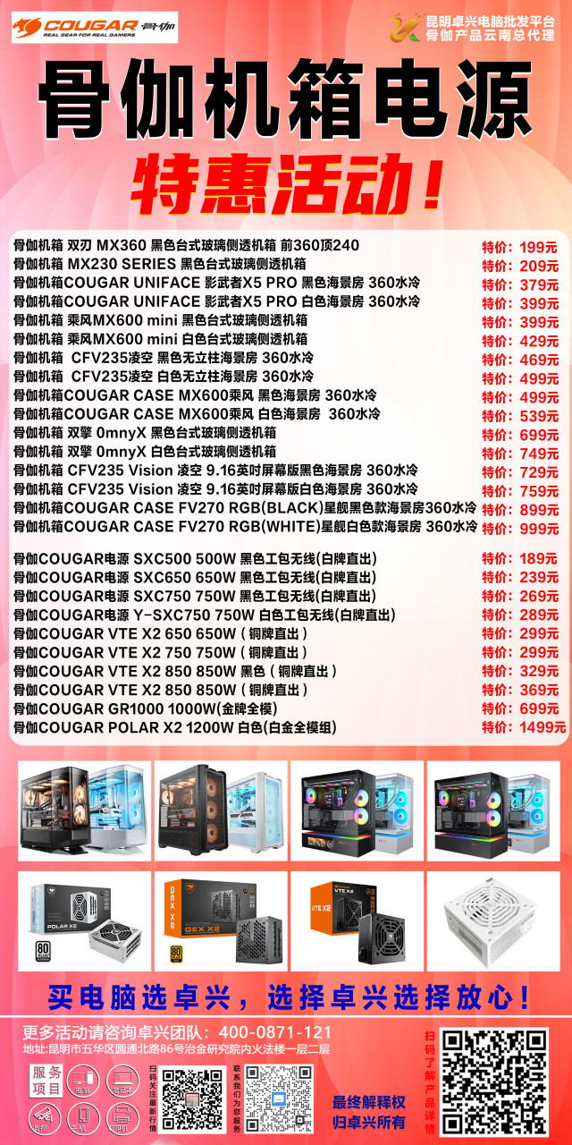 在云南电脑 DIY 与硬件批发领域,昆明卓兴电脑批发平台早已是业内公认的实力标杆。自 2002 年成立以来,平台深耕春城昆明,辐射全省,凭借二十余年的诚信经营与供应链积累,构建起覆盖全品类电脑硬件的批发服务体系。如今,作为骨伽(COUGAR)机箱云南独家总代理,卓兴平台更将国际顶尖的机箱产品与本土优质服务深度融合,为云南各地经销商、装机店与电竞爱好者,带来正品保障、货源稳定、售后无忧的骨伽全系列机箱产品,成为云南电脑硬件市场中品质与实力的双重代名词。