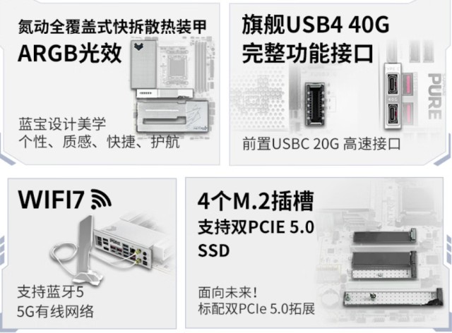 3. 网络与连接:高效适配高速场景网络与接口配置直接影响使用体验,蓝宝石主板针对不同场景优化连接能力: 高速网络:旗舰型号搭载 Wi‑Fi 7+2.5GbE 有线网卡,传输速率与抗干扰能力全面升级,适配 4K/8K 视频流、大文件高速传输与低延迟电竞对战;主流型号配备 Wi‑Fi 6+2.5GbE 组合,兼顾性价比与实用性。 接口丰富度:前置 USB‑C 10Gbps 接口、后置多规格 USB 接口(含 5Gbps 高速口),满足键鼠、U 盘、显示器等多设备同时连接;部分型号配备 4 个 ARGB 插针,支持 TRIXX‑M 光效同步,打造个性化整机外观。