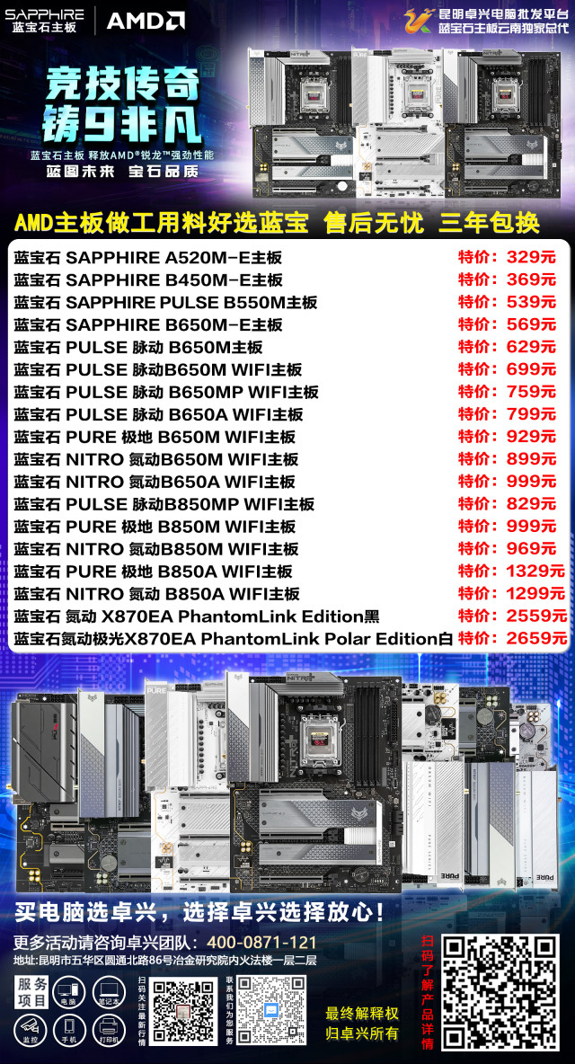 蓝宝石主板以精准供电设计、前瞻扩展能力、高效网络配置为核心,覆盖办公、电竞、创作、工业四大场景,完美适配 AMD 全系列处理器。从入门装机到旗舰定制,从日常使用到专业创作,蓝宝石主板凭借硬核参数与稳定品质,成为 AMD 平台全场景赋能的核心伙伴。 选择蓝宝石主板,就是选择以参数为基、以生态为翼,轻松解锁硬件全场景潜力,打造高效、稳定、可持续升级的 AMD 专属平台。