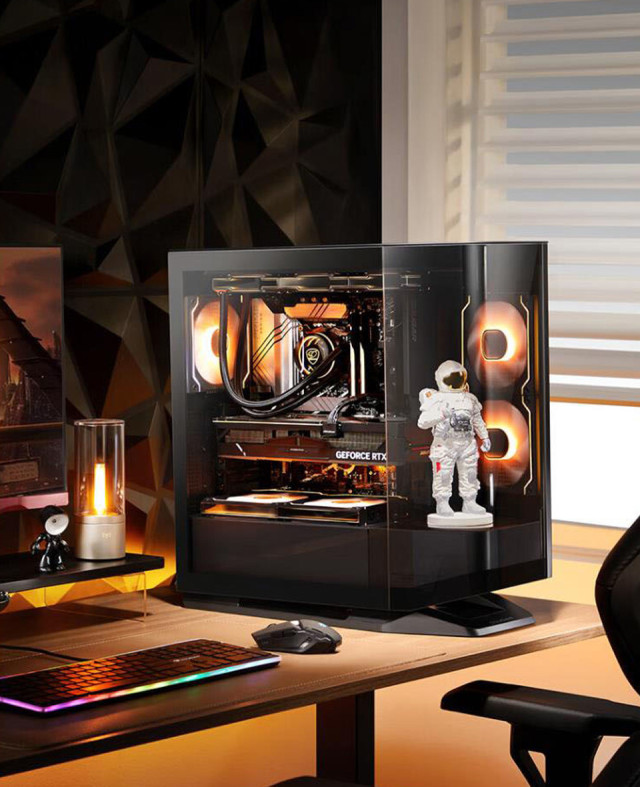 兼容性拉满:支持 E-ATX/ATX 等全规格主板,显卡限长 420mm,CPU 散热限高 180mm,轻松容纳这套旗舰硬件。预装 4 把 ARGB 风扇(3×140mm+1×120mm),支持主板光效同步,打造沉浸式电竞氛围。支持背插 BTF 架构,与蓝宝石背插主板、显卡完美适配,实现 “无线” 装机;丰富的硬盘位与免工具快拆设计,装机与维护更便捷。黑色磨砂外观 + 棱角科幻设计,兼具质感与个性,成为桌面颜值焦点。