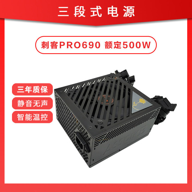 采用 M.2 2280 标准尺寸,PCIe3.0×4 高速 NVMe 协议,搭载 3D 闪存颗粒,官方连续读取最高 2000MB/s,连续写入 1600MB/s,搭配 SLC 缓存技术,系统开机、软件启动、文件加载速度飞快XPG。 512GB 容量足够安装 Windows 系统、办公软件、常用程序、影音文件、少量游戏,无机械硬盘卡顿延迟问题;3 年官方质保,抗震耐摔,功耗低无噪音,平均无故障时长超 150 万小时,家用数据存储稳定安全,后期硬盘容量不足,可利用主板第二 M.2 插槽直接加装大容量固态,扩容简单便捷。 (五)电源机箱:稳定供电 + 颜值侧透,家用耐用搭配 三段式电源 刺客 PRO690 额定 500W 稳定台式机电源