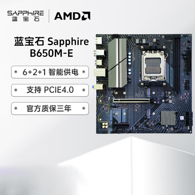 针对 R5-8500G 低功耗特性,搭配天极风 S60 炫彩版六铜管散热器,塔式散热结构搭配六根高效导热铜管,大面积散热鳍片 + 静音风扇设计。 处理器满载运行时热量快速导出,散热余量充足,长期使用温度稳定,风扇低转速运行噪音微弱,居家办公、夜间使用几乎无感噪音;自带炫彩灯光效果,搭配玻璃侧透机箱,内部光效简约耐看,兼顾散热实用性与机箱颜值,完全满足这颗 CPU 全场景散热需求,后期小幅升级 CPU 也无需更换散热器。 (三)主板载体:蓝宝石 B650M E,AM5 平台耐用拓展型主板