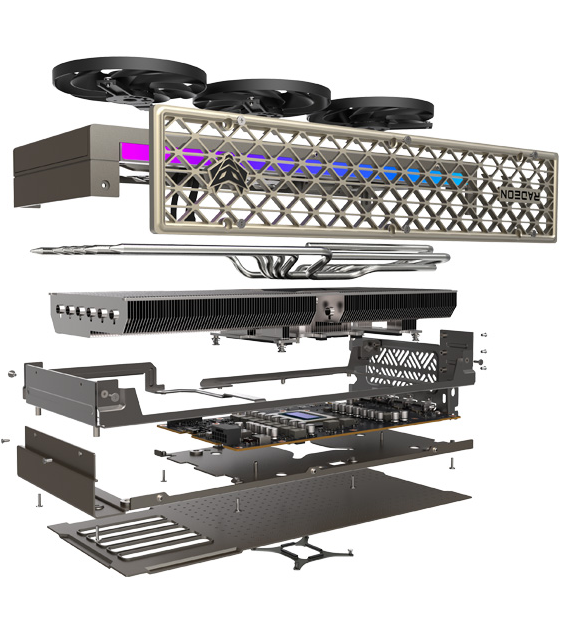二、创新突破:Phantomlink 幻影连接,告别线材束缚 传统显卡 12VHPWR 供电线杂乱、影响风道与装机颜值的痛点,在这款显卡上被彻底解决。蓝宝石与华硕深度合作研发的Phantomlink(GC-HPWR/BTF)幻影连接技术,是显卡设计的革命性突破。 背插供电,无线美学:采用华硕 BTF2.5 标准,短时承载功率超 1000W,兼容所有 GC-HPWR/BTF 接口主板。搭配蓝宝石 NITRO+ X870EA Phantomlink 系列主板时,可通过主板背部接口直接供电,显卡正面零可见线材,既整洁美观,又避免供电线弯折、接触不良的风险。 一卡双模,兼容无忧:Phantomlink 接口支持快拆切换,可在 12V-2x6 与 GC-HPWR 两种供电模式间自由切换。不使用背插主板时,可通过磁吸式金属背板隐藏传统供电线,兼顾背插玩家的极简需求与传统主板用户的实用性,实现 “一卡两用”。 稳定可靠,供电无忧:幻影连接技术采用高规格供电触点,电流传输更纯净稳定,无供电瓶颈,即使高负载满功耗运行,也能保障供电持续稳定,为性能释放筑牢基础SAPPHIRE。 三、散热与外观:氮动旗舰设计,颜值实力双在线