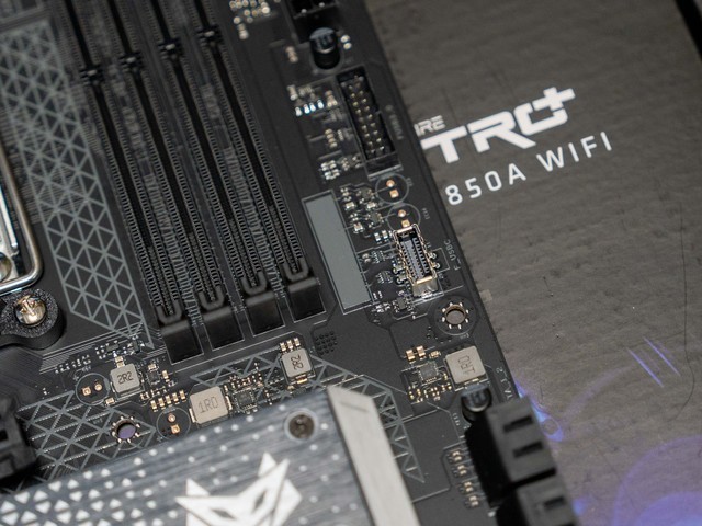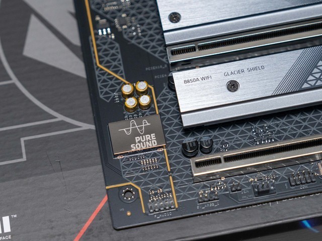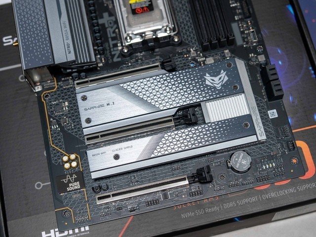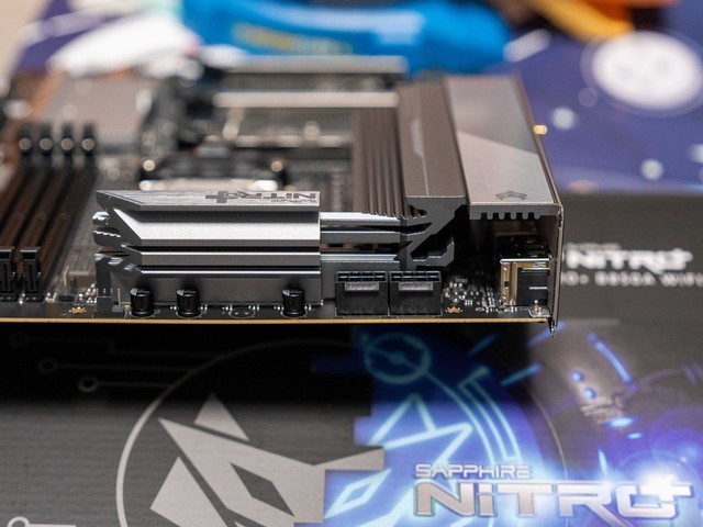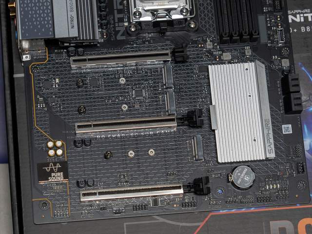 蓝宝石 NiTRO+氮动 B850A主板提供三个金属加固的全长PCIe插槽,第一条为PCIe5.0x16通道,以应对新一代显卡平1台的带宽需求;第二条为PCIe4.0x4通道,第三条为PCIe4.0x2通道,保留拓展性。
