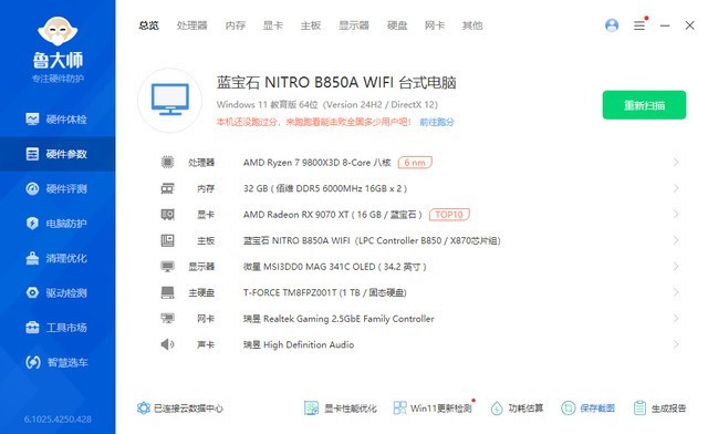 娱乐大师跑分,9800X3D得分993539,综合性能得分2502788,击败全国98%用户。