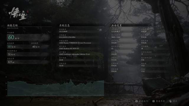 《黑神话:悟空》4K影视级,光追中,FSR55,平均帧数60,最低帧数40。AMD全家桶在这一代光追性能提升不少,而蓝宝石氮动RX 9070XT OC不仅理论性能直追5070TI,实测之下3A大作开光追也能流畅运行。