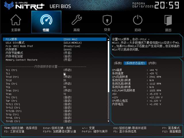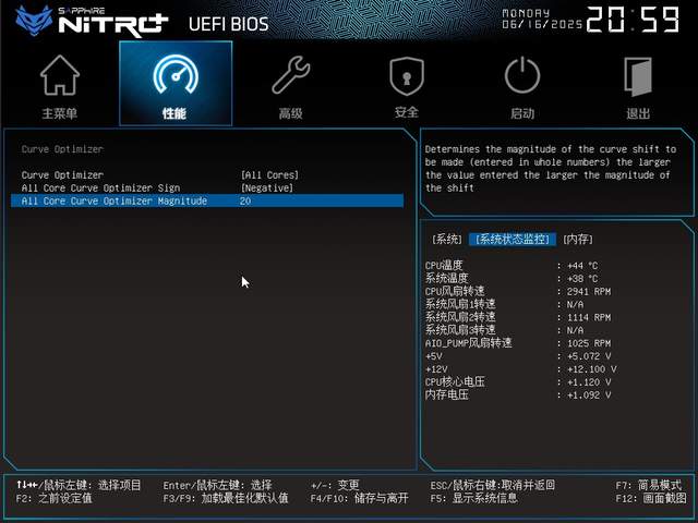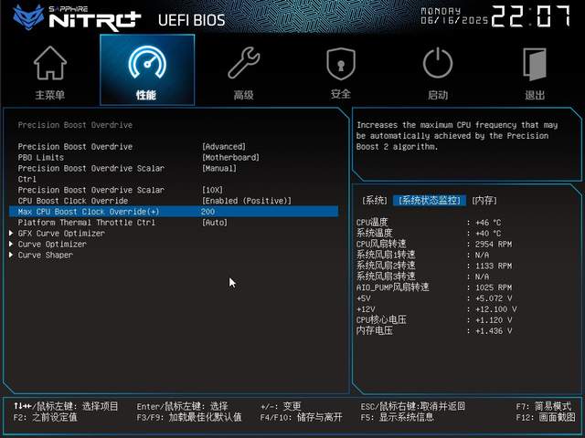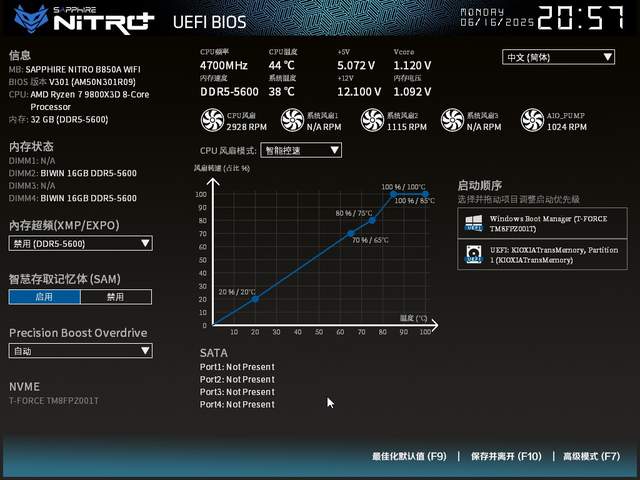 默认性能测试亮机后我们先看看蓝宝石 NiTRO+氮动 B850A主板的BIOS,风格延续氮动系列,使用简约的页面设计,可以一眼看到核心参数。常用功能都在首页,包括XMP/EXPO,PBO,风扇模式,还有启动项,很方便。